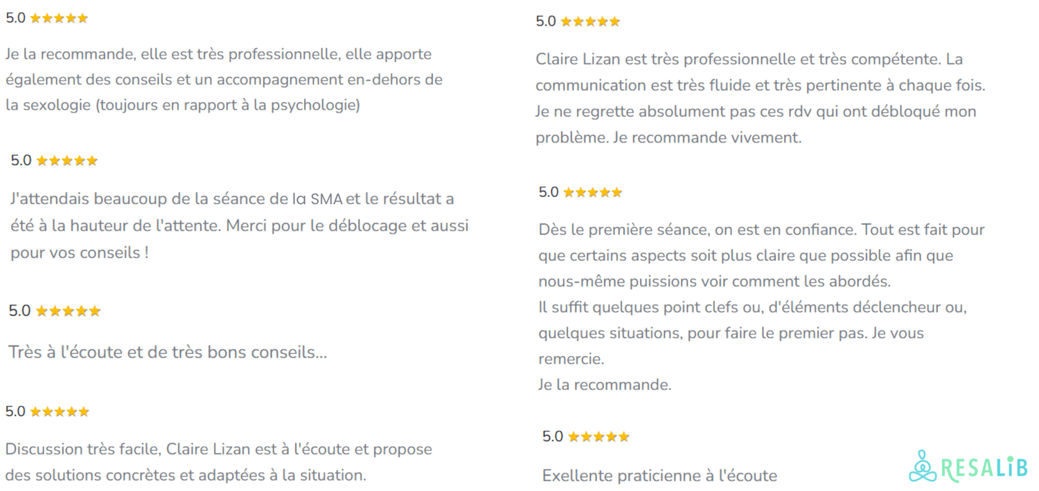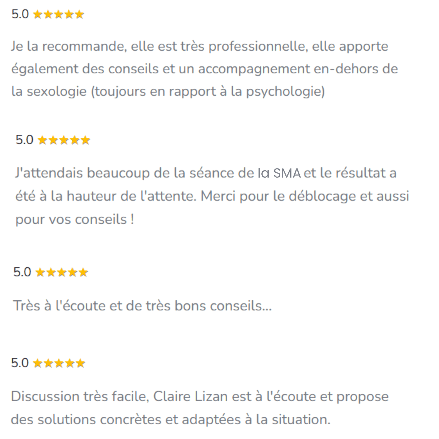 Je suis Claire Lizan, sexothérapeute spécialisée dans les blocages conscients et inconscients, thérapeute de couple et conférencière.